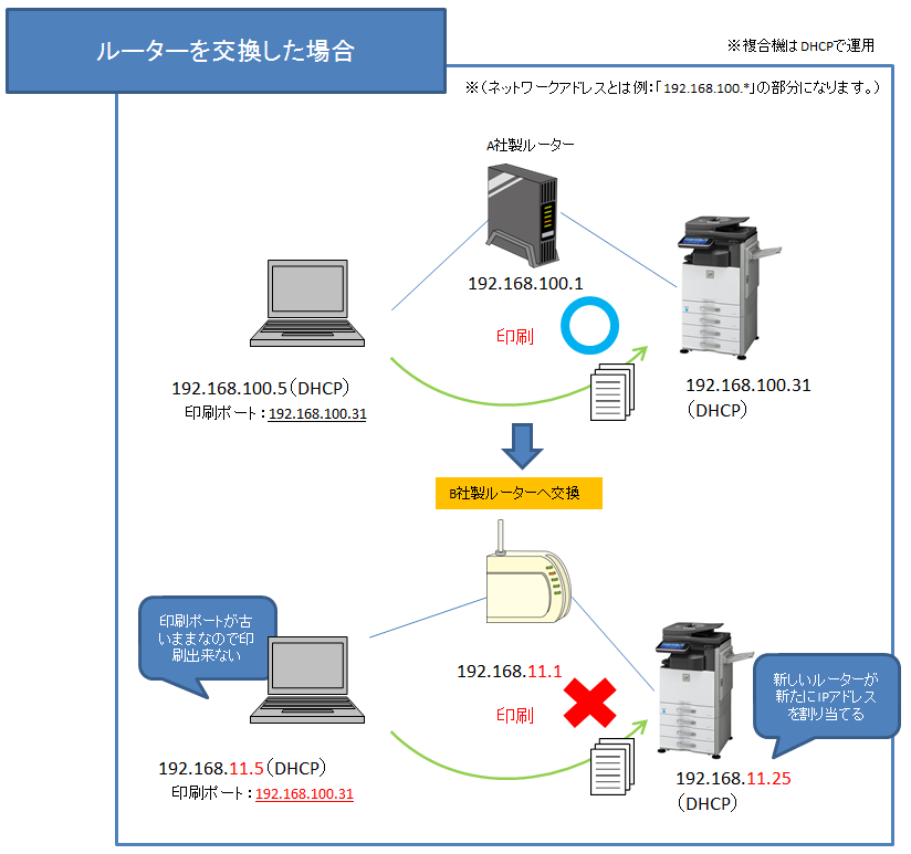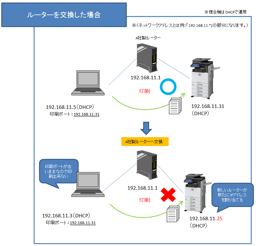 以前使用していたルーターとは違うメーカーのものを使用した場合は、以前とは違うネットワークアドレスを割り当てるケースがよくあります。パソコンと複合機には交換したルーターから新しいIPアドレスが配布(設定)されますので、パソコンと複合機の通信ができない事象が発生する場合があります。