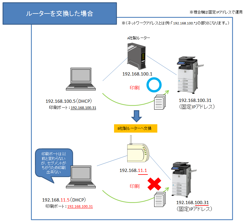 パソコンには交換したルーターから新しいIPアドレスが配布(設定)されますが、複合機のIPアドレスは以前のまま(固定IPアドレス)のため、パソコンと複合機の通信ができない事象が発生する場合があります。