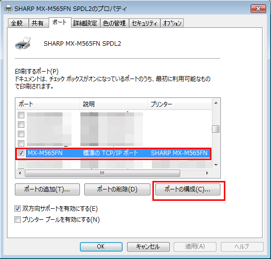 ④「印刷するポート」設定画面が表示されますので、ポート欄でこれまで使用していた複合機の名前(またはIPアドレス)を選択し、[ポートの構成(C)]を押してください。