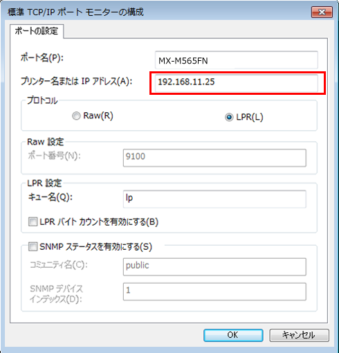 ⑤「標準TCP/IPポートモニターの構成」画面が表示されますので、「プリンター名またはIPアドレス(A)」に新しいプリンター名またはIPアドレスを設定してください。