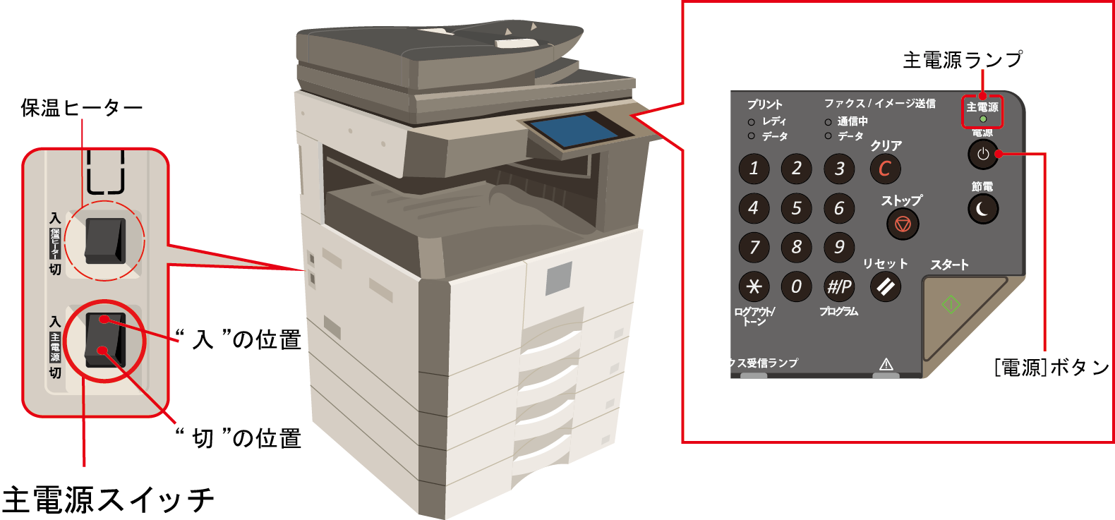 本機の電源は、主電源スイッチ(左側面の後ろ側下段)と、[電源]ボタン(操作パネル上)で操作します。
