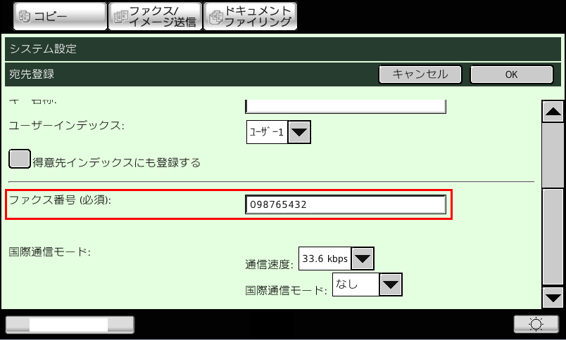 ②「宛先のタイプ」欄で「ファクス」を選び、「宛先名(必須)」「検索文字(必須)」「ファクス番号(必須)」を入力してください。