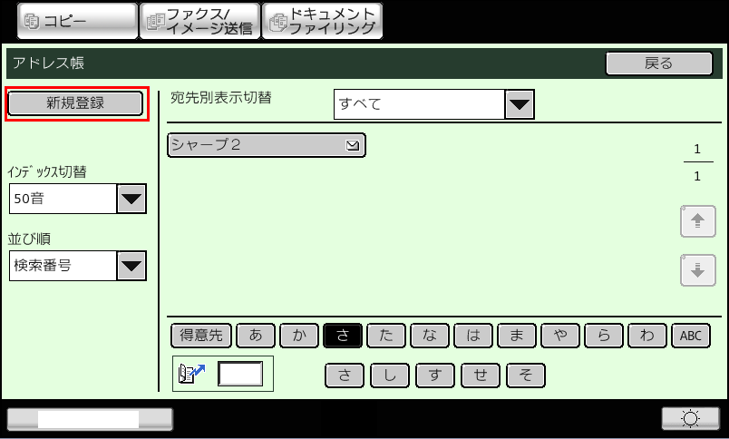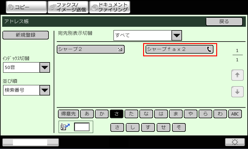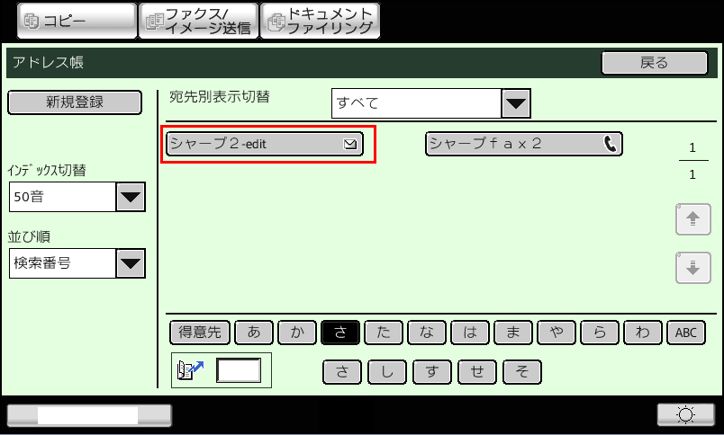 ①「アドレス帳」画面で、修正/削除したい宛先(例:シャープ2)を押してください。