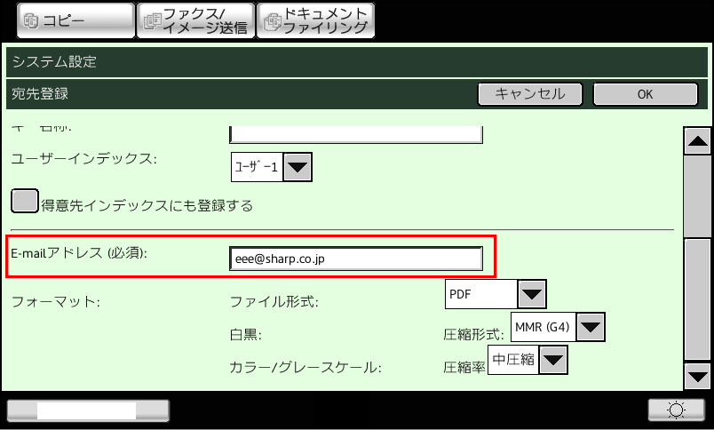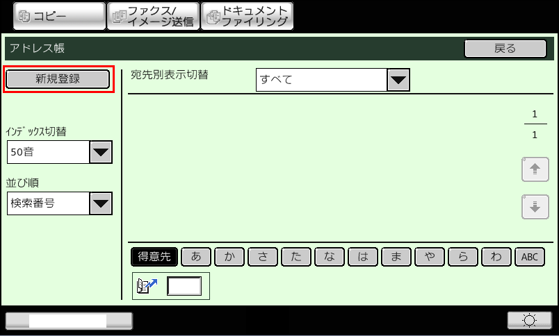 アドレス帳に宛先を新規登録するときや、登録済みの宛先を変更したり、削除するときは、システム設定の「宛先登録」から「アドレス帳」画面を表示してください。