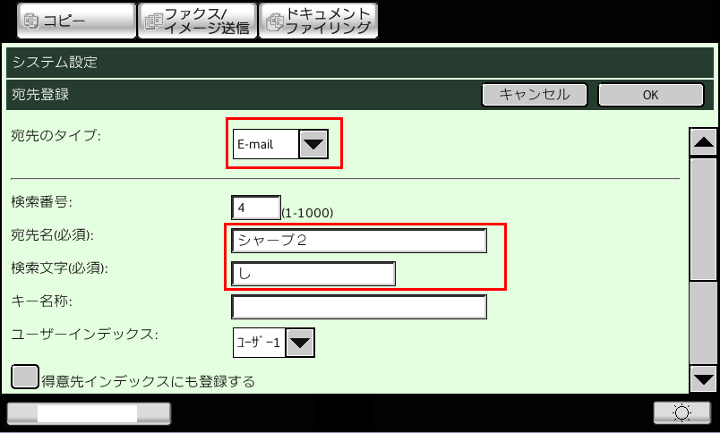 ②「宛先のタイプ」欄で「E-mail」を選び、「宛先名(必須)」「検索文字(必須)」「E-mailアドレス(必須)」を入力してください。