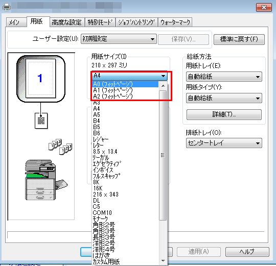 プリンタードライバーの用紙サイズに表示される[A0(フィットページ)]はどのように使うのですか?(FAQ No.00803)