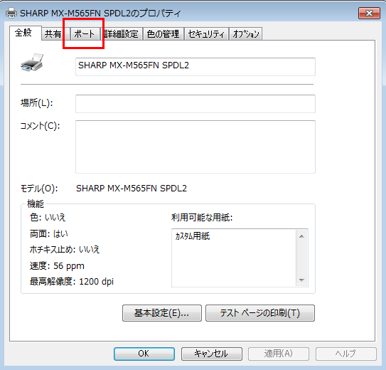 ③「当該プリンターのプロパティ」画面が表示されますので、[ポート]タブを押してください。