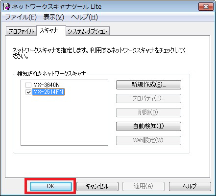 ③自動検知が終了すると、「検知されたネットワークスキャナ」欄に検知結果が表示されますので、スキャナとして利用している「複合機」の名前(またはIPアドレス)を選択してください。