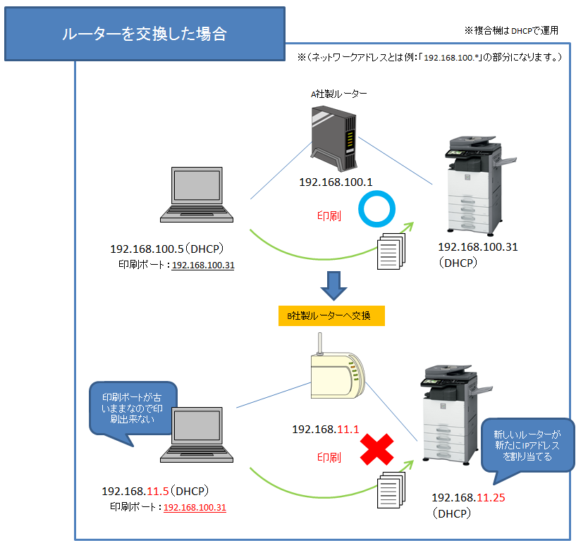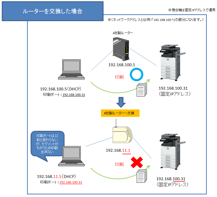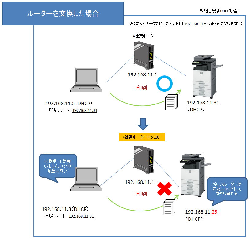 パソコンには交換したルーターから新しいIPアドレスが配布(設定)されますが、複合機のIPアドレスは以前のまま(固定IPアドレス)のため、パソコンと複合機の通信ができない事象が発生する場合があります。