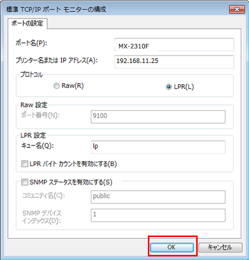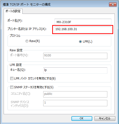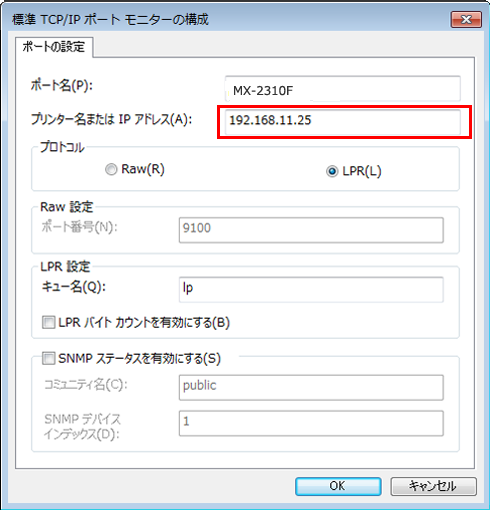 ⑤「標準TCP/IPポートモニターの構成」画面が表示されますので、「プリンター名またはIPアドレス(A)」に新しいプリンター名またはIPアドレスを設定してください。