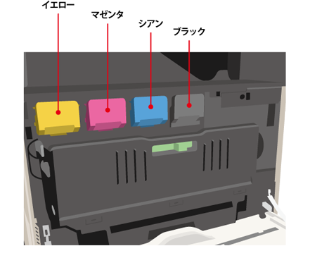 4色のトナーカートリッジが、前カバーの裏側に挿入されています。