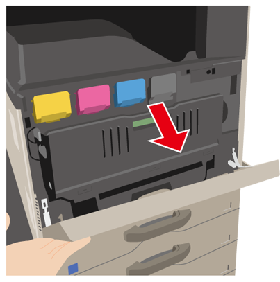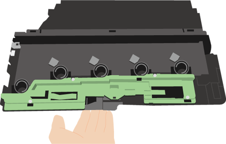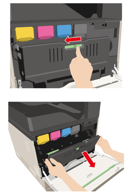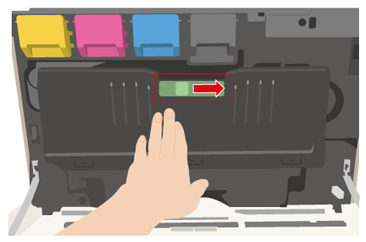 緑色のロック解除ボタンを左にスライドさせてください。ロックが解除されると、トナー回収容器が手前に倒れてきますので、倒れ切るまで倒してください。