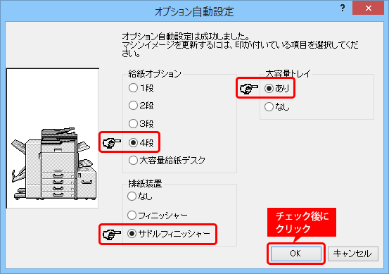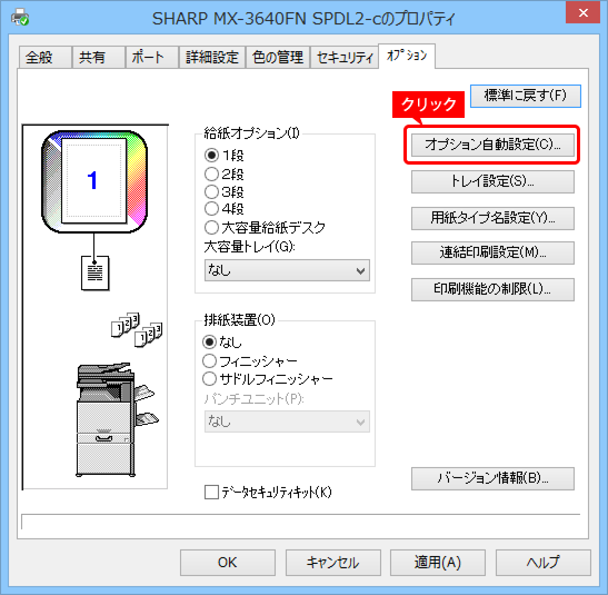 プリンタードライバーをインストールした後は、複合機に装着している給紙トレイやフィニッシャーなどが使えるよう、プリンタードライバーに設定をします。