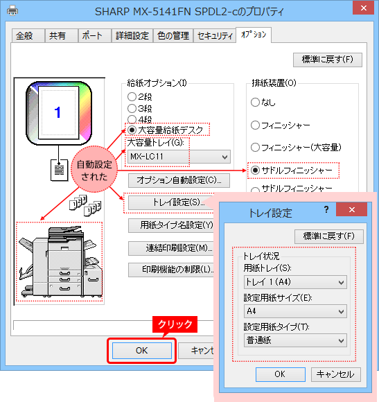 プリンタードライバーをインストールした後は、複合機に装着している給紙カセットやフィニッシャーなどが使えるよう、プリンタードライバーに設定をします。