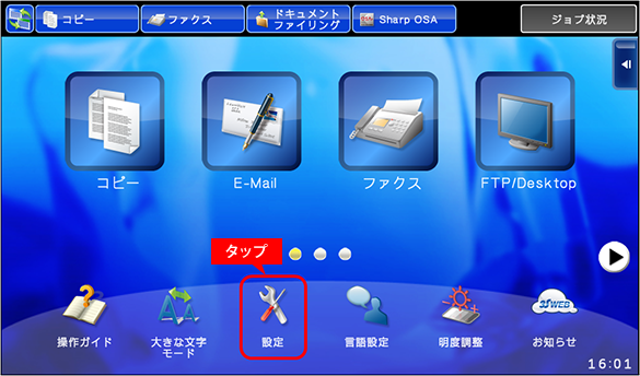 タッチパネルのホーム画面にある[設定]をタップします。