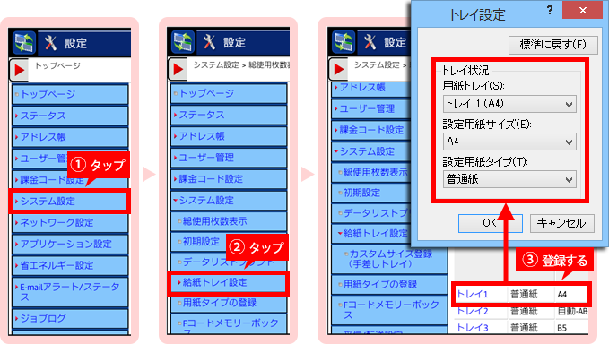 6. トレイ設定に登録する。