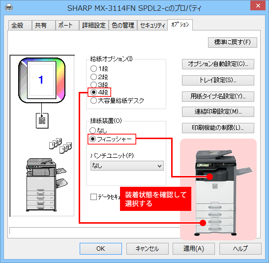プリンタードライバーをインストールした後は、複合機に装着している給紙カセットやフィニッシャーなどが使えるよう、プリンタードライバーに設定をします。