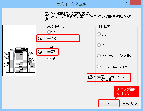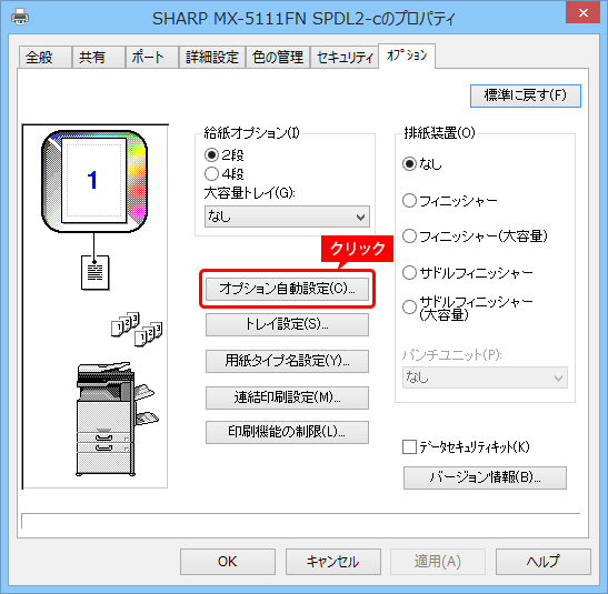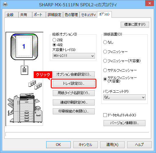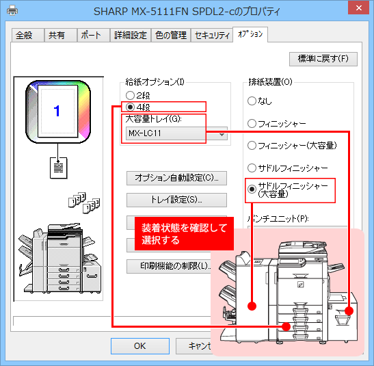 プリンタードライバーをインストールした後は、複合機に装着している給紙トレイやフィニッシャーなどが使えるよう、プリンタードライバーに設定をします。
