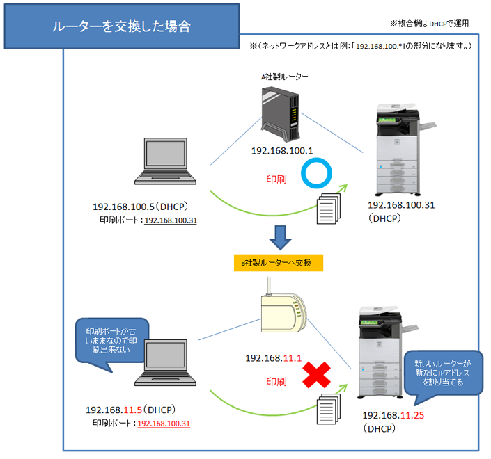 パソコンには交換したルーターから新しいIPアドレスが配布(設定)されますが、複合機のIPアドレスは以前のまま(固定IPアドレス)のため、パソコンと複合機の通信ができない事象が発生する場合があります。