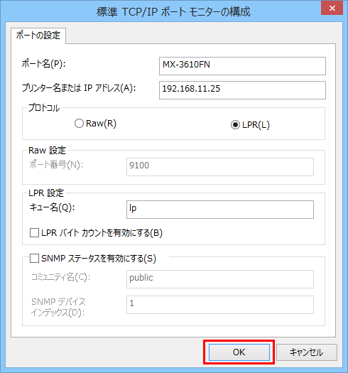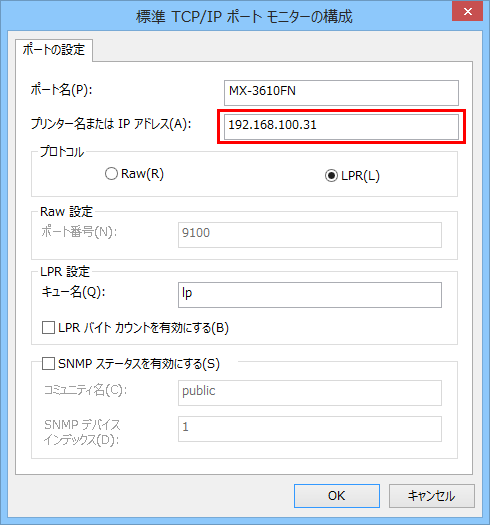 ⑤「標準TCP/IPポートモニターの構成」画面が表示されますので、「プリンター名またはIPアドレス(A)」に新しいプリンター名またはIPアドレスを設定してください。。