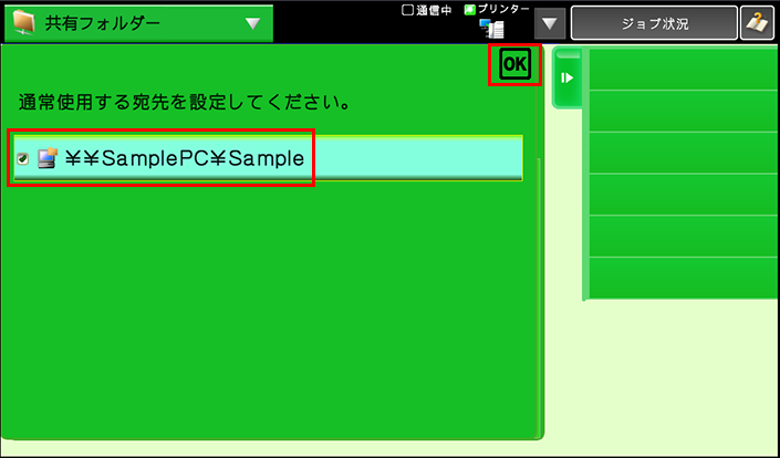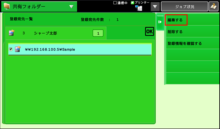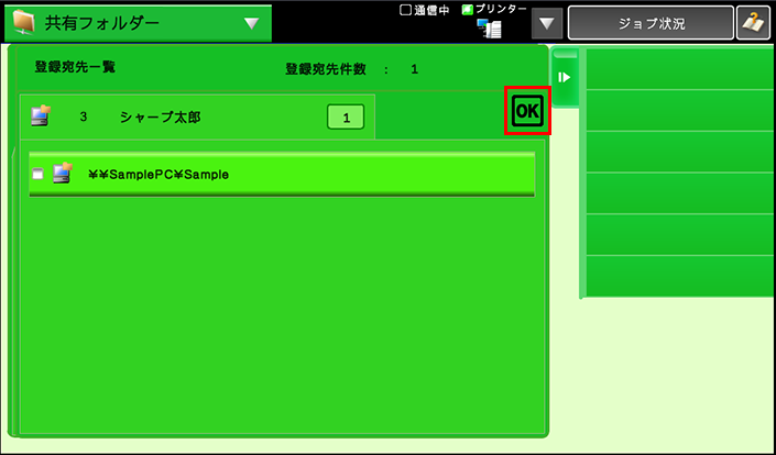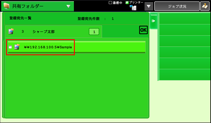 ⑧「登録宛先一覧」画面が表示されますので、対象の[送信先(例:\\192.168.100.5\Sample)]を押してください。