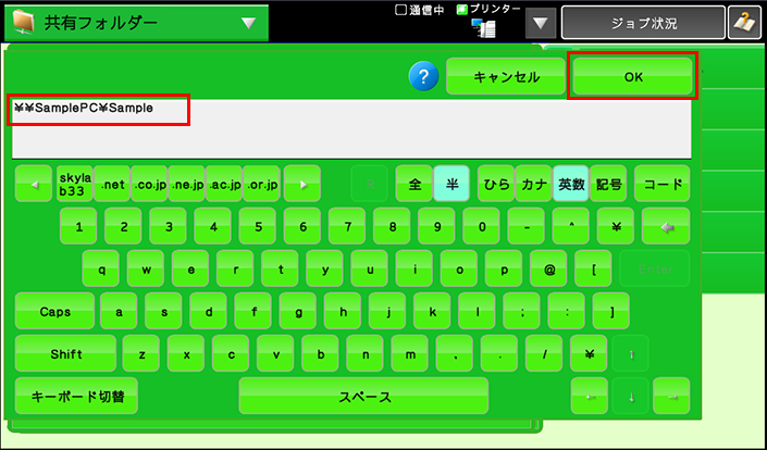 ⑪ 共有フォルダーパスの入力画面が表示されますので、事前確認したコンピューター名で共有フォルダーパス(例:\\Sample-PC\Sample)を入力して[OK]を押してください。