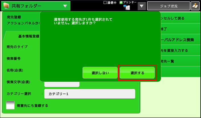 ※「通常使用する宛先が1件も選択されていません。選択しますか?」画面が表示されましたら、[選択する]を押してください。