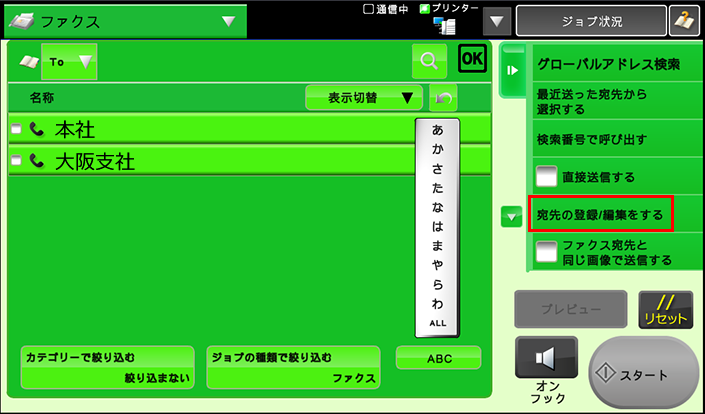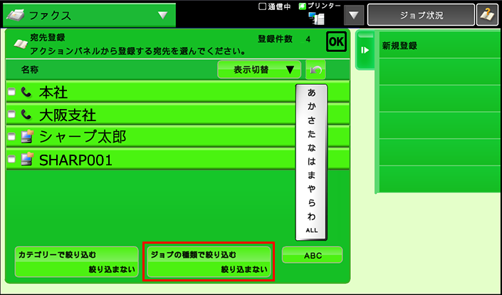 ③「宛先登録」画面が表示されますので、[ジョブの種類で絞り込む]を押してください。