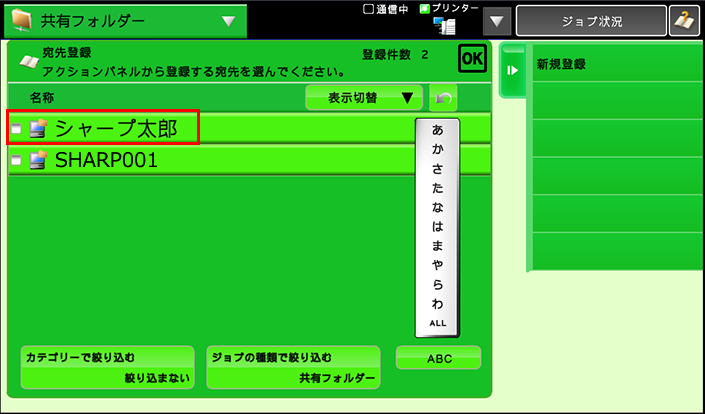 ⑤「共有フォルダー」の宛先が含まれる送信先一覧が表示されますので、一覧から対象の宛先名(例:シャープ太郎)を押してください。