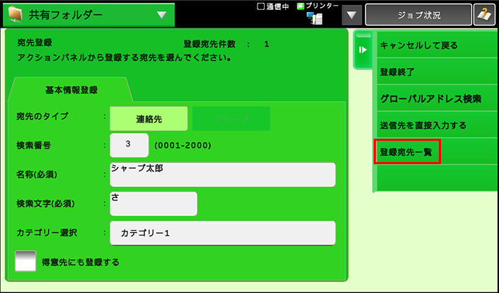 ⑭「宛先登録」画面に戻りますので、アクションパネルの[登録終了]を押してください。