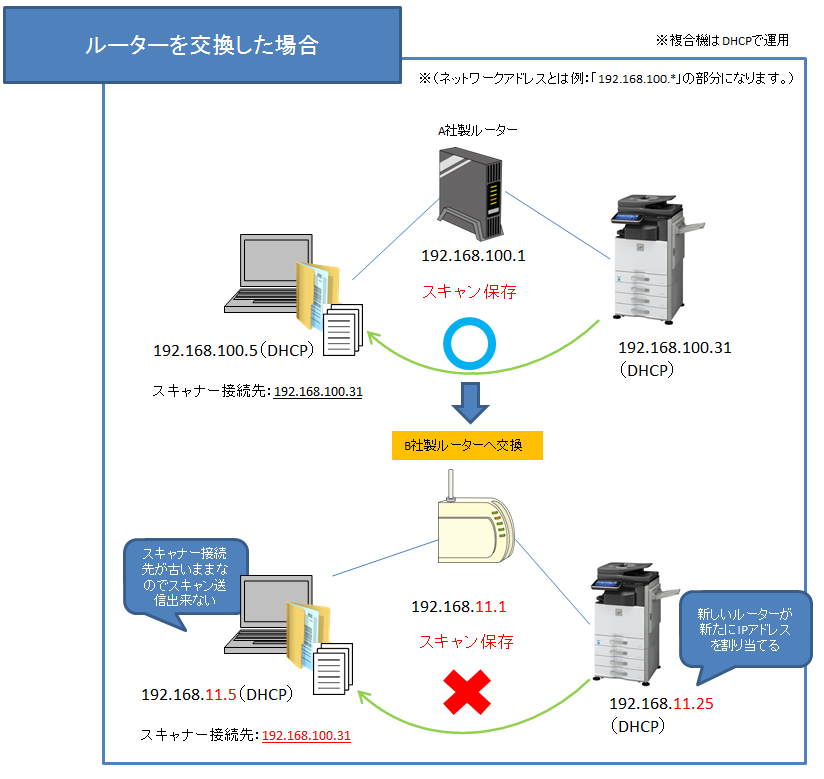 以前使用していたルーターとは違うメーカーのものを使用した場合は、以前とは違うネットワークアドレスを割り当てるケースがよくあります。パソコンと「複合機」には交換したルーターから新しいIPアドレスが配布(設定)されますので、「パソコン」と「複合機」の通信ができない事象が発生する場合があります。