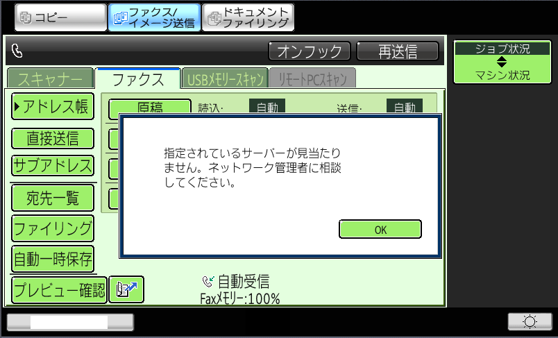 ネットワークスキャナツール Liteで作成されたプロファイルへスキャンする際、 宛先が見つからない場合などに表示されます。