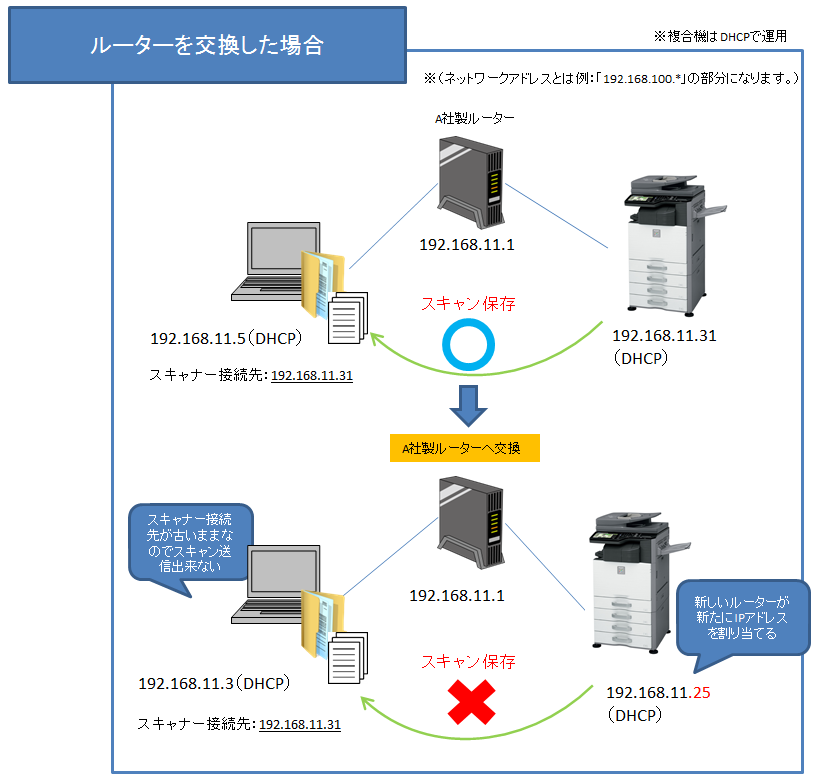 以前使用していたルーターとは違うメーカーのものを使用した場合は、以前とは違うネットワークアドレスを割り当てるケースがよくあります。パソコンと「複合機」には交換したルーターから新しいIPアドレスが配布(設定)されますので、「パソコン」と「複合機」の通信ができない事象が発生する場合があります。