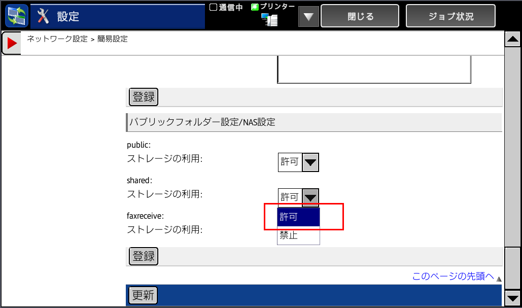 「システム設定」で「パブリックフォルダー設定/NAS設定」のストレージの利用を「許可」にすることで「複合機」の共有フォルダーを有効にすることができます。