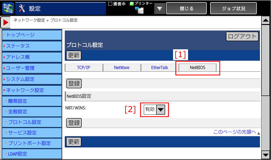 ②「プロトコル設定」画面が表示されますので、[1]「NetBIOS」タブを選択し、「2」「NBT/WINS」が[有効]になっていることを確認してください。