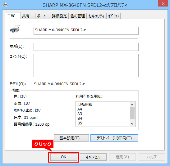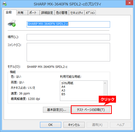 下図はMX-3640FNのSPDL2-cドライバーのプロパティ画面です。