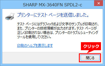 表示されたダイアログボックスにある[閉じる]ボタンをクリックして、印刷されたテストページを確認します。