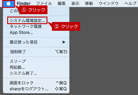 Appleマークをクリックし、表示されたメニューにある「システム環境設定...」をクリックします。