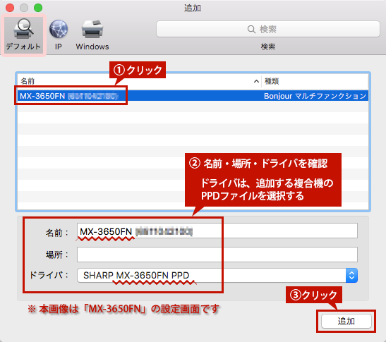 ドライバは、追加する複合機のPPDファイルが選択されているか確認します。問題なければ、[追加]ボタンをクリックします。本画像は、「MX-3650FN」の設定画面です。