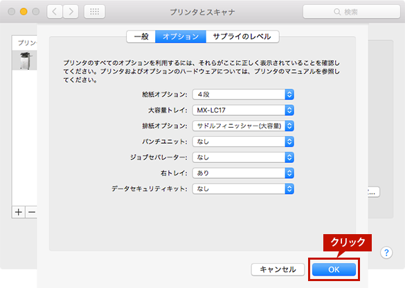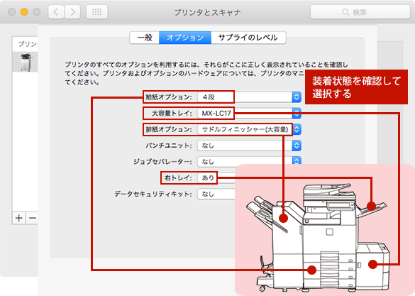 プリンタードライバーをインストールした後は、システム環境設定にて複合機を追加します。また、複合機に装着している給紙トレイやフィニッシャーなどが使えるよう、プリンタードライバーに設定をします。