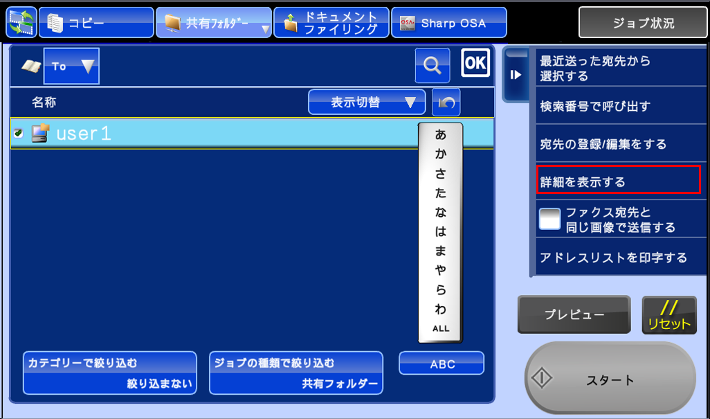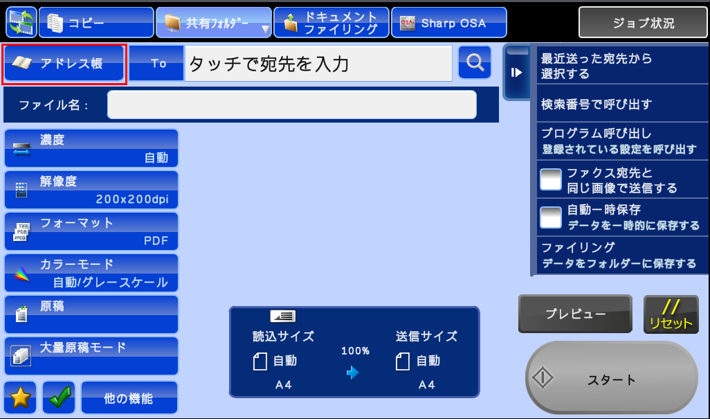 ②「共有フォルダー」画面が表示されますので、[アドレス帳]を押してください。