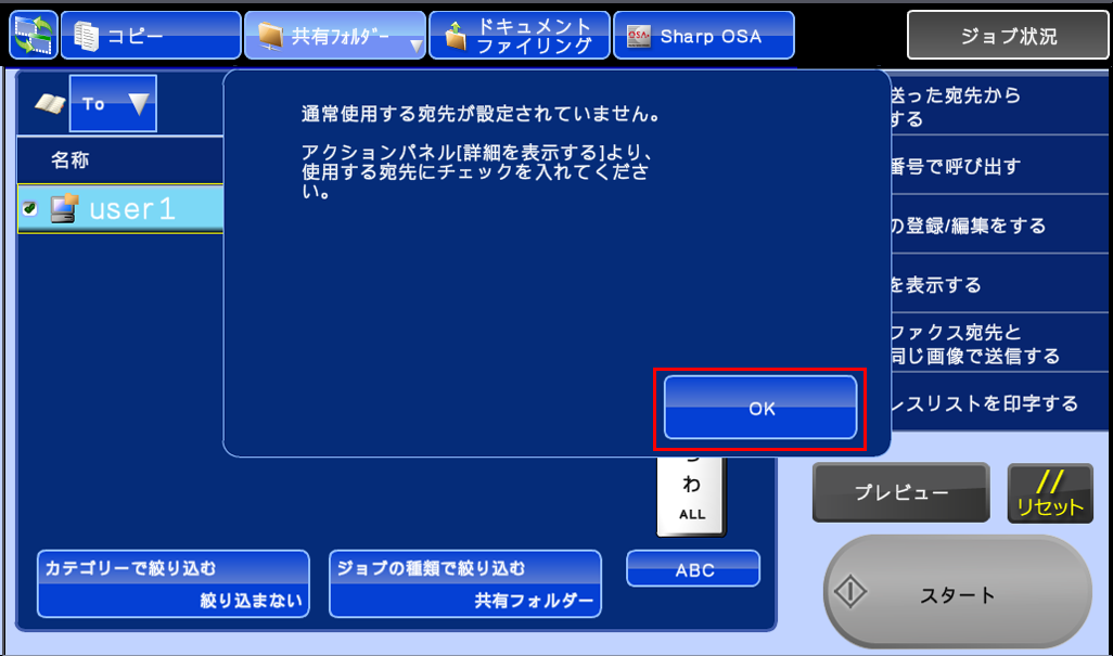 ④「通常使用する宛先が設定されていません。~」のダイアログが表示されましたら[OK]を押してください。