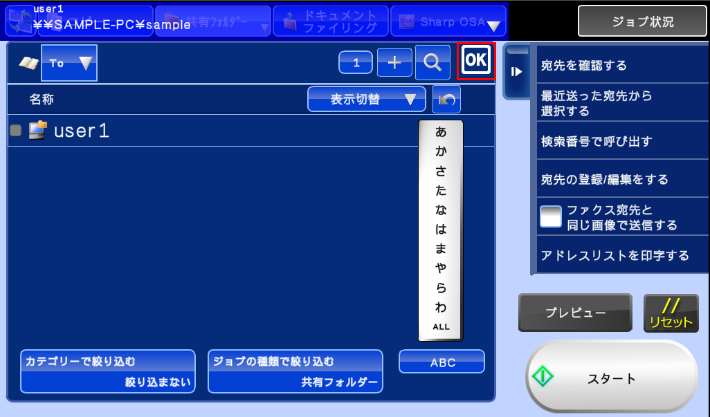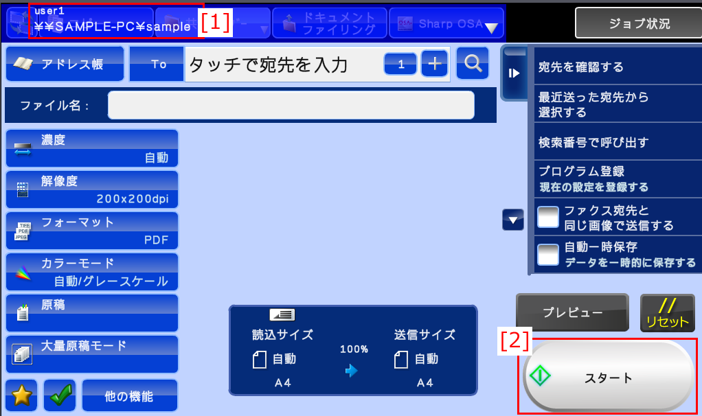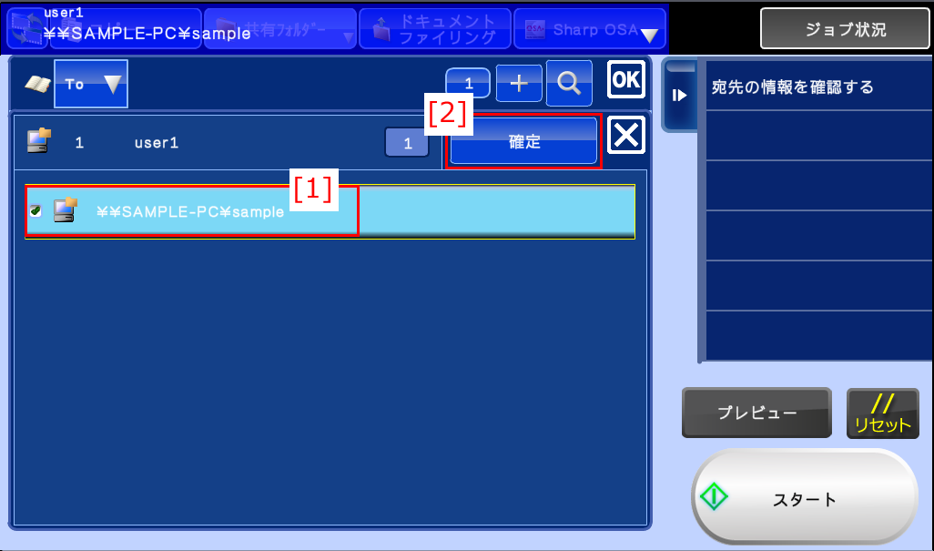 ⑧選択した[1]宛先(例:\\SAMPLE-PC\sample)が正しいことを確認し、[2][スタート]を押して下さい。
