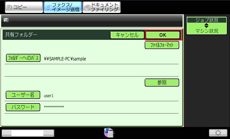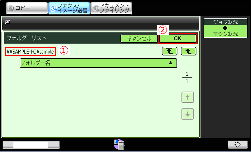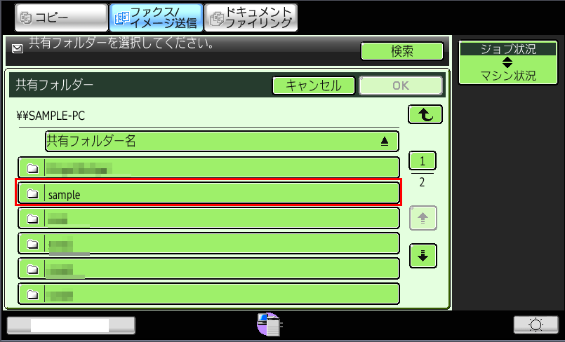 ⑬共有フォルダーのトップ画面に戻りますので、選択した宛先(例:\\SAMPLE-PC\sample)が正しいことを確認し、[スタート](本体ボタン)を押して下さい。