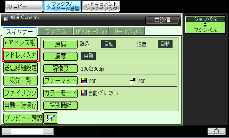 ③「スキャナー」画面が表示されますので、[アドレス入力]を押してください。