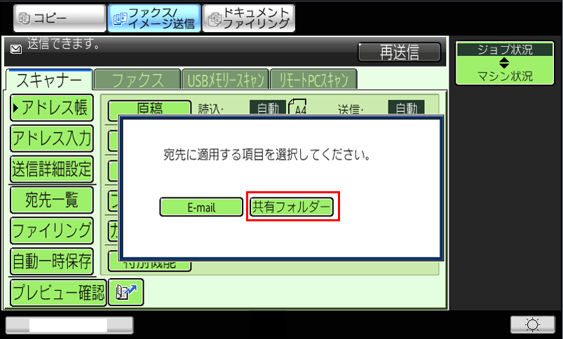 ④「宛先に適用する項目を選択してください。」と表示されますので、[共有フォルダー]を押してください。