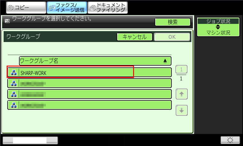| ワークグループ/サーバー/共有フォルダーの各画面の[検索]ボタンを押して、検索文字を入力すると対象のもののみを各画面の一覧に表示させることができます。※検索文字が「SHARP」の場合は、「SHARP」の完全一致及び部分一致のものが対象になります。(例:「SHARP」、「SHARP-001」など) |