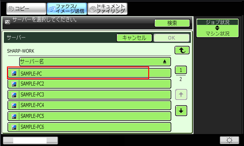 ⑦「サーバー」画面が表示されますので、共有フォルダーを作成している[サーバー(例:SAMPLE-PC)]を選択してください。
