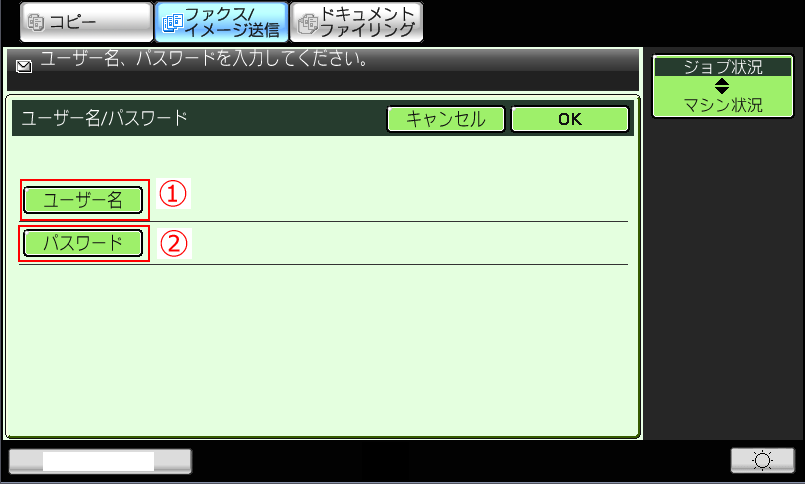 ⑧「ユーザー名/パスワード」画面が表示されますので、①「ユーザー名」と②「パスワード」を押してそれぞれ入力してください。