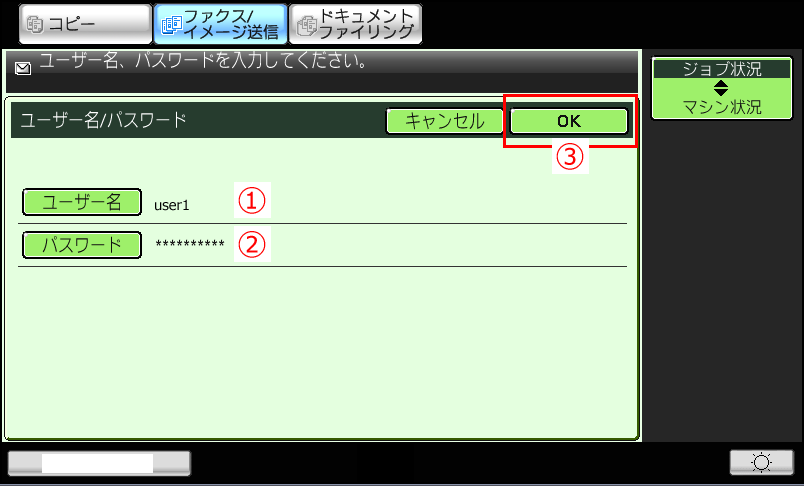 ⑨入力後、①「ユーザー名(例:user1)」と②「パスワード(例:*****)」を確認後、③[OK]を押してください。